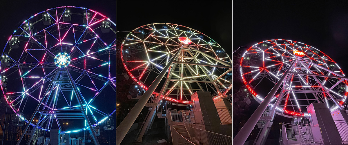 这是一个很大的俄罗斯摩天轮。这个摩天轮上使用了两种不同的led像素灯。